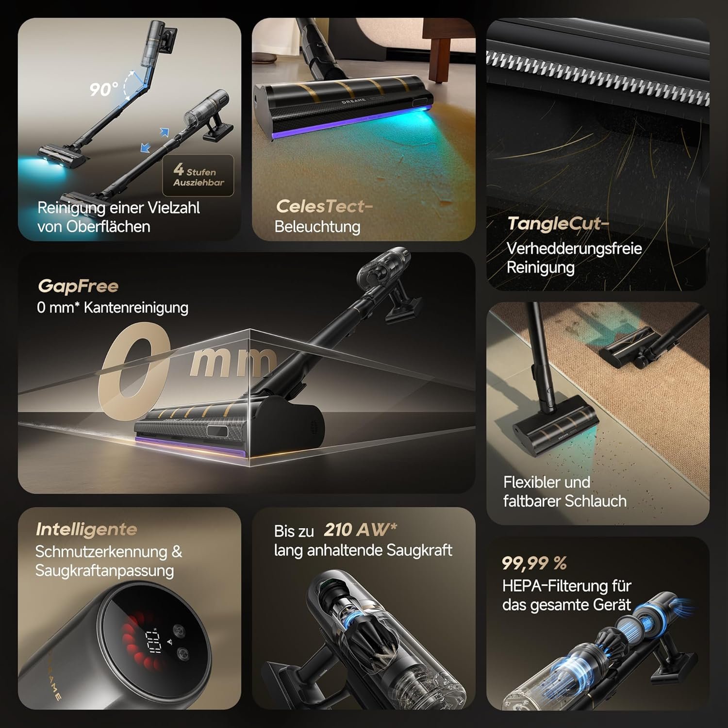 | Bürsten-Technologie | GapFree-KI-Arm (0 mm Kante), TangleCut (durchtrennt Haare) |